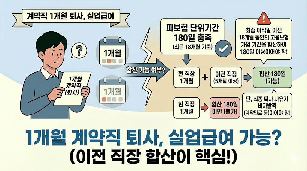 따라서 전 직장 경력과 합산하여 180일 요건을 이미 갖춘 상태라면, 마지막 직장에서 딱 한 달(예: 4월 1일~4월 30일)만 일했어도 실업급여 수급 대상자가 맞습니다. 2개월은 법에서 정한 필수 조건이 절대 아닙니다.